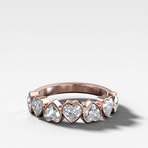 A halfway eternity style band featuring a continuous half loop of alternating heart shape cut diamonds. Each embraced by their own personal case of gold.