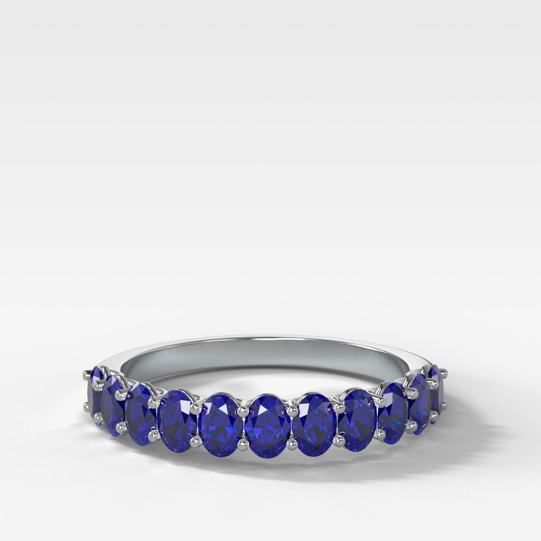 This Petite Shared Prong Wedding Band with Blue Oval Sapphires is perfect for those that want something a bit more subtle. The 3.5mm wide band consists of tiny oval cut sapphires with a petite shared prong setting that allows maximum sparkle with minimal bulk.