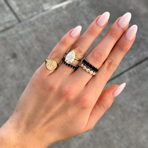 This Petite Shared Prong Wedding Band with Blue Oval Sapphires is perfect for those that want something a bit more subtle. The 3.5mm wide band consists of tiny oval cut sapphires with a petite shared prong setting that allows maximum sparkle with minimal bulk.