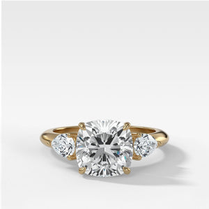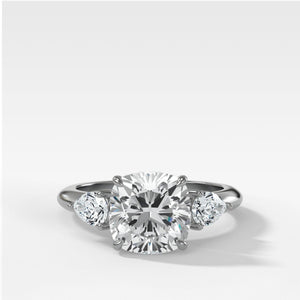 Send ring sizerA classic three stone ring set on a 2.40mm wide band, featuring one Cushion Cut diamond flanked by two pear shape diamond sides, perfectly matched to your chosen center gemstone.