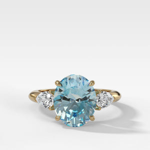 A classic three stone ring set on a 2.40mm wide band, featuring one Oval aquamaine flanked by two pear shape diamond sides, perfectly matched to your chosen center gemstone.