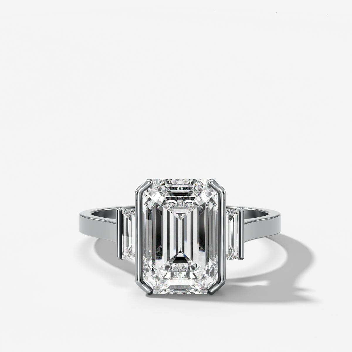 Three Stone Half Bezel Engagement Ring with Mini Baguette Side Stones and Emerald Cut Diamond No.2