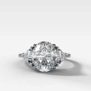 A sexy three stone engagement ring that all edge - two rare "shield cut" diamonds flank the center stone of your choice. In this case, it's an Oval cut diamond.