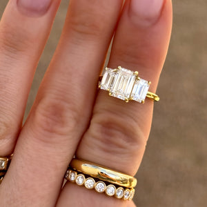 A large diamond in the shape of your choice is flanked by two (only slightly) smaller gems, all set in single claw prongs: simply, elegantly jaw-dropping.
