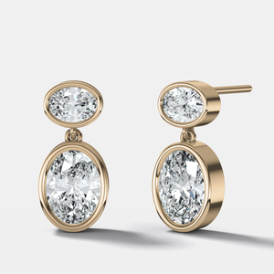 These bezel-set cushion diamonds feature a striking east-west stud anchored by a delicate drop that reveals a north-south oval below, creating graceful movement and balanced dimension.