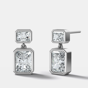 These bezel-set cushion diamonds feature a striking east-west stud anchored by a delicate drop that reveals a north-south radiants below, creating graceful movement and balanced dimension.